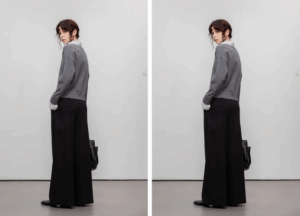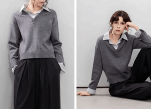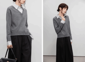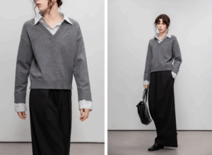 A woman wearing a patchwork striped lapel sweater