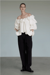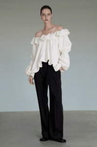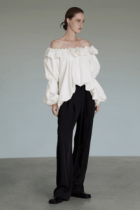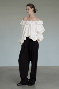 Parisian allure, one-shoulder charm.