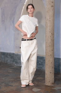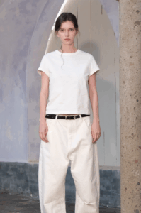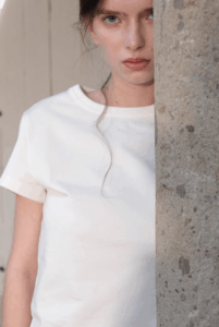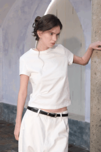 Timeless cotton tee, sharp shoulder line.